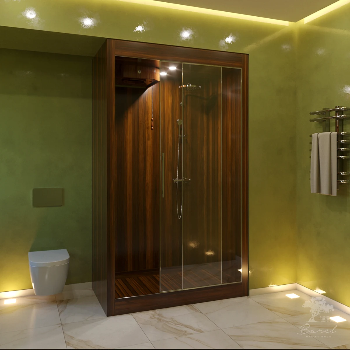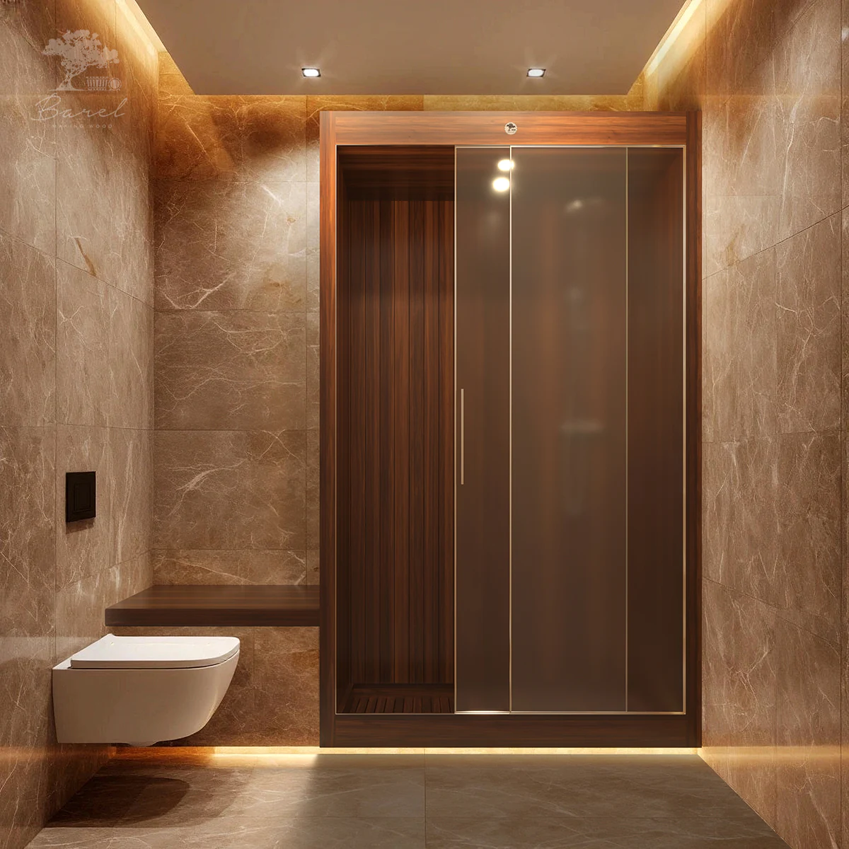Кабина идеально подойдёт к современному премиальному дизайну интерьера. Она изготавливается из высококачественной древесины с привлекательными оттенками и выразительной текстурой. В процессе создания душевой кабины применяется оригинальная технология Barelwood. Все деревянные элементы соединяются по принципу «ёлочки», что гарантирует идеальную герметичность и предотвращает протечки. Древесина обрабатывается специальным составом, который защищает её от гниения и предотвращает развитие грибка и бактерий. Экологичность древесины и её положительное влияние на здоровье, включая укрепление иммунной системы, делают душевую кабину отличным выбором.